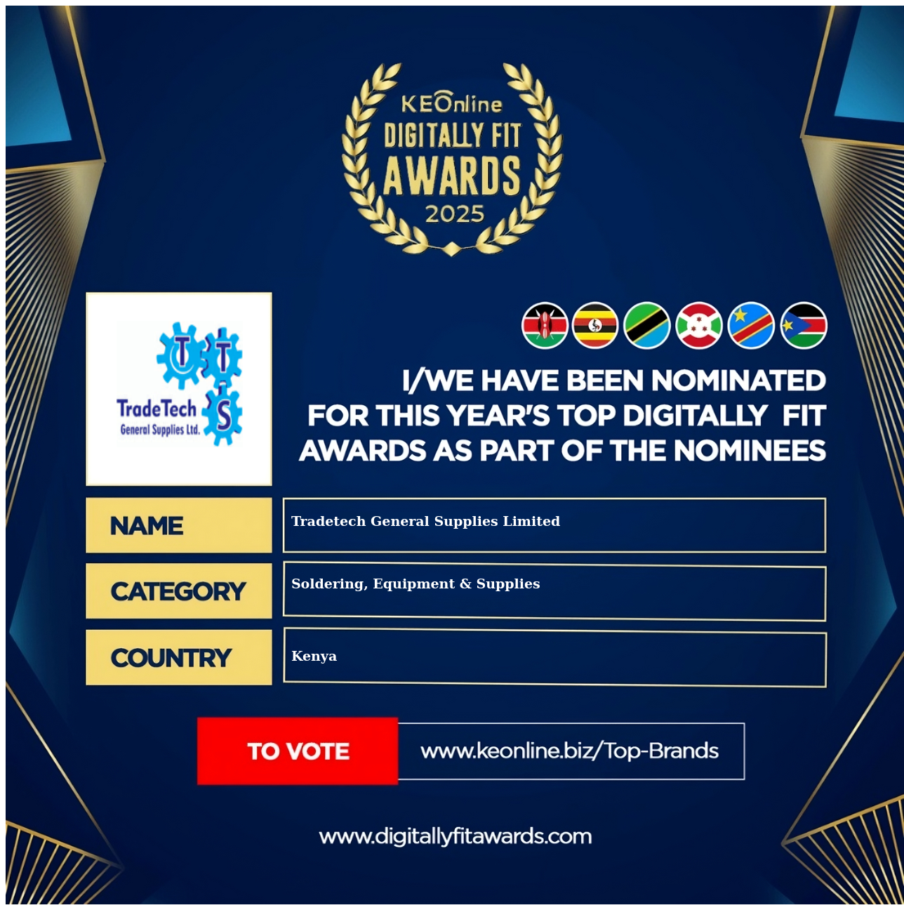 Tradetech General Supplies Limited is a company that specializes in Soldering, Equipment & Supplies, Welding Equipment & Supplies, Industrial Equipment & Safety, The company has showed exemplary performance in services/products delivery. Tradetech General Supplies Limited is located in Kenya, Nairobi County and the address/physical location is at C9 Indaa business Park, Dakar Road, Nairobi, Kenya. Are you the owner of this Business? Click here to claim it and update it fully.