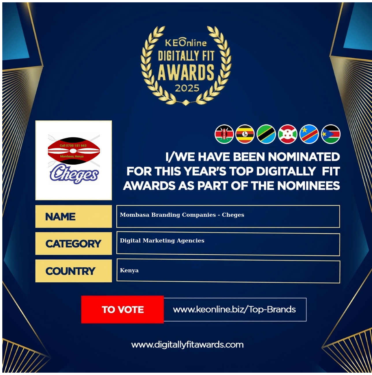 Mombasa Branding Companies - Cheges is a company that specializes in Digital Marketing Agencies, Graphic Designing, Screen Printing Services, Tailoring & Embroidery Services, Media & Advertising Agencies, The company has showed exemplary performance in services/products delivery. Mombasa Branding Companies - Cheges is located in Kenya, Mombasa County and the address/physical location is at Msanifu Kombo. Are you the owner of this Business? Click here to claim it and update it fully.