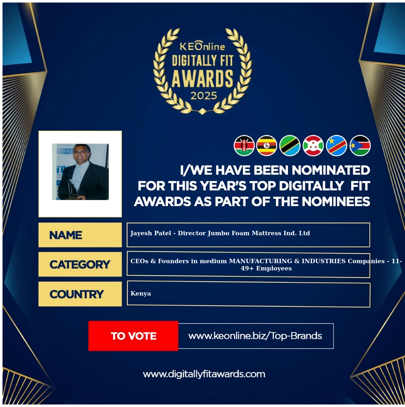 Jayesh Patel - Director Jumbo Foam Mattress Ind. Ltd is a company that specializes in CEOs & Founders in medium MANUFACTURING & INDUSTRIES Companies - 11-49+ Employees, The company has showed exemplary performance in services/products delivery. Jayesh Patel - Director Jumbo Foam Mattress Ind. Ltd is located in Kenya, Nairobi and the address/physical location is at X street address. Are you the owner of this Business? Click here to claim it and update it fully.