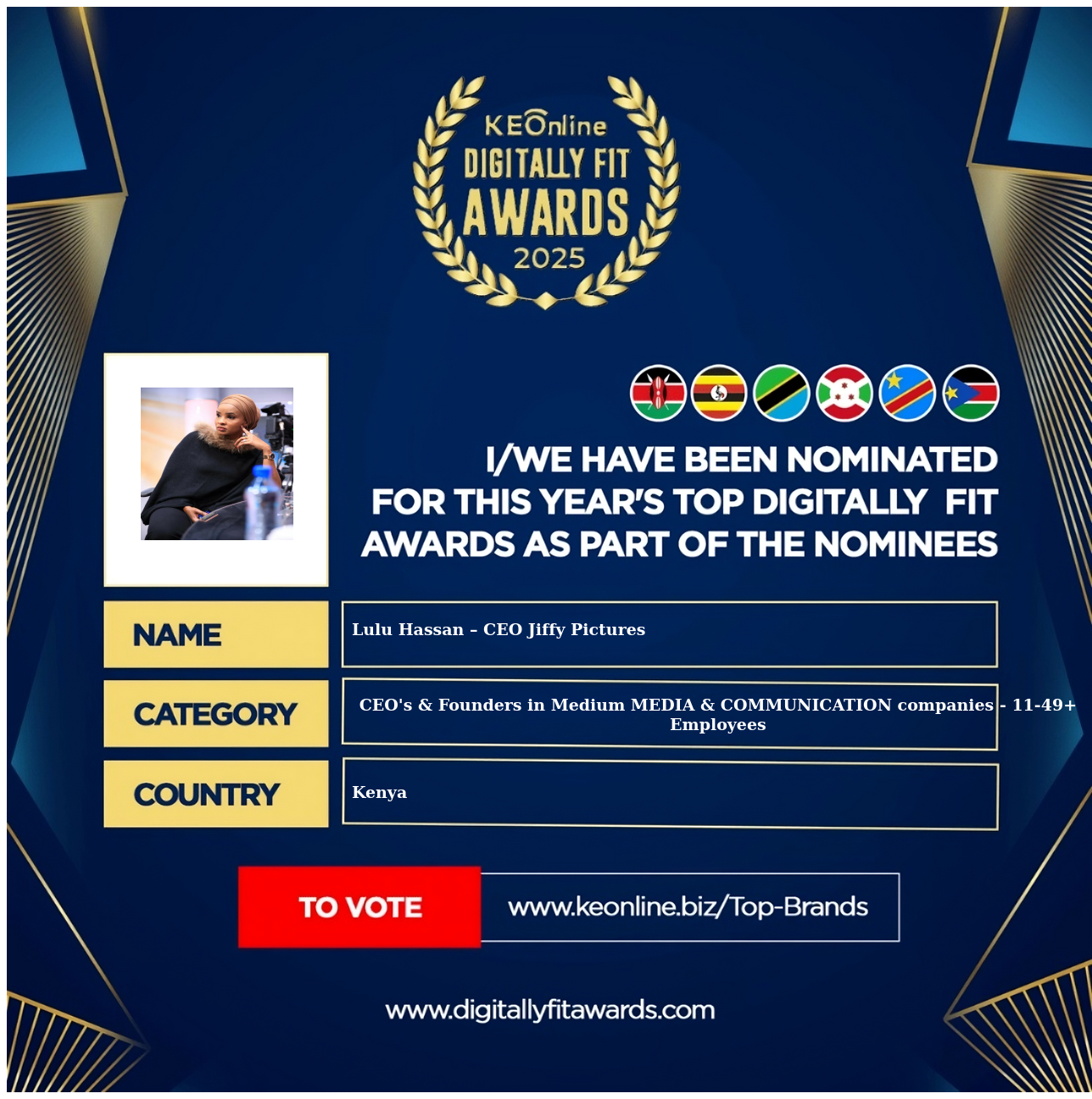 Lulu Hassan – CEO Jiffy Pictures is a company that specializes in CEO's & Founders in Medium MEDIA & COMMUNICATION companies - 11-49+ Employees, The company has showed exemplary performance in services/products delivery. Lulu Hassan – CEO Jiffy Pictures is located in Kenya, and the address/physical location is at X street address. Are you the owner of this Business? Click here to claim it and update it fully.