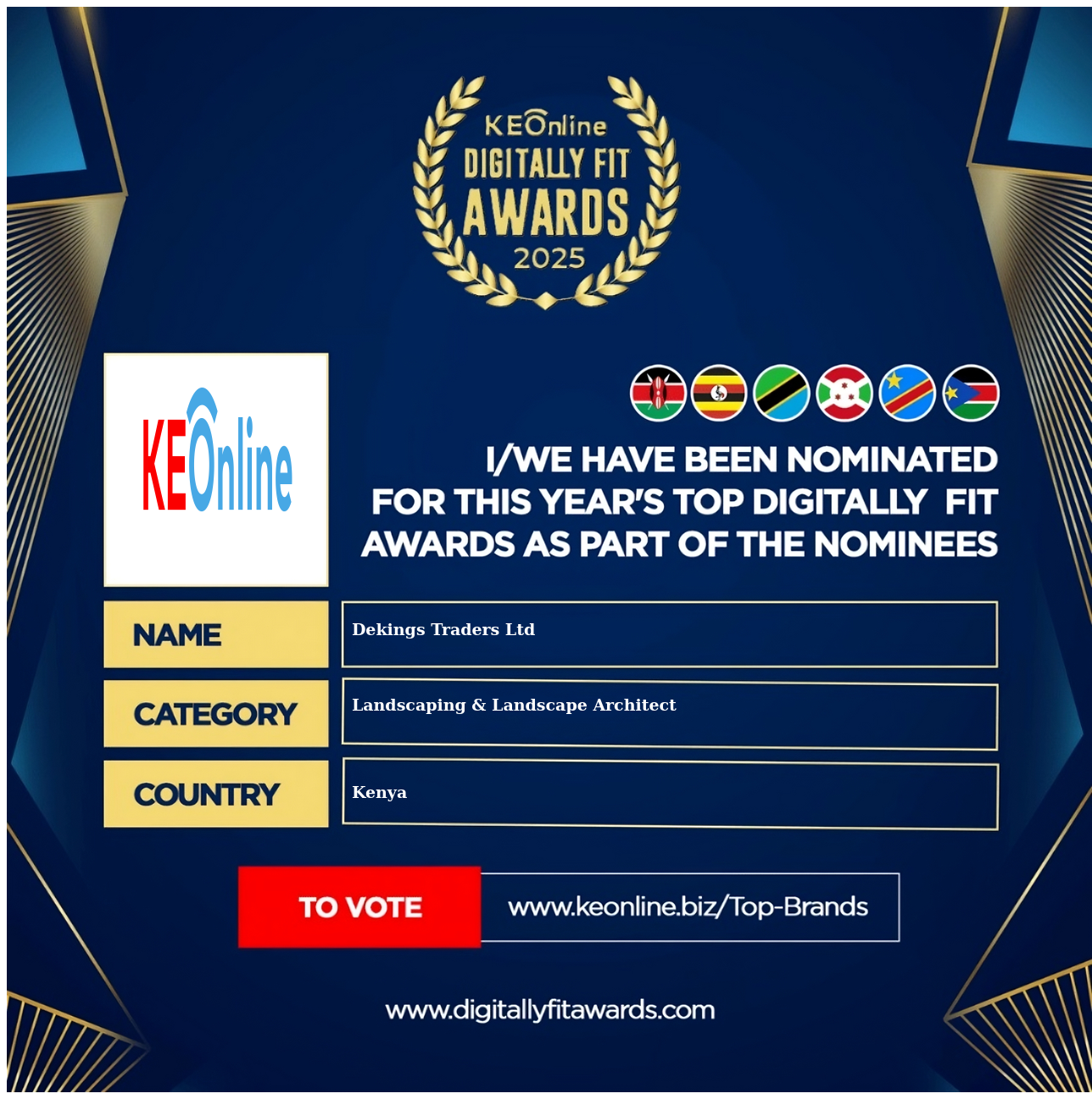 Dekings Traders Ltd is a company that specializes in Landscaping & Landscape Architect, The company has showed exemplary performance in services/products delivery. Dekings Traders Ltd is located in Kenya, Nairobi and the address/physical location is at Nairobi Central koinange kenya house, Nairobi, Kenya. Are you the owner of this Business? Click here to claim it and update it fully.
