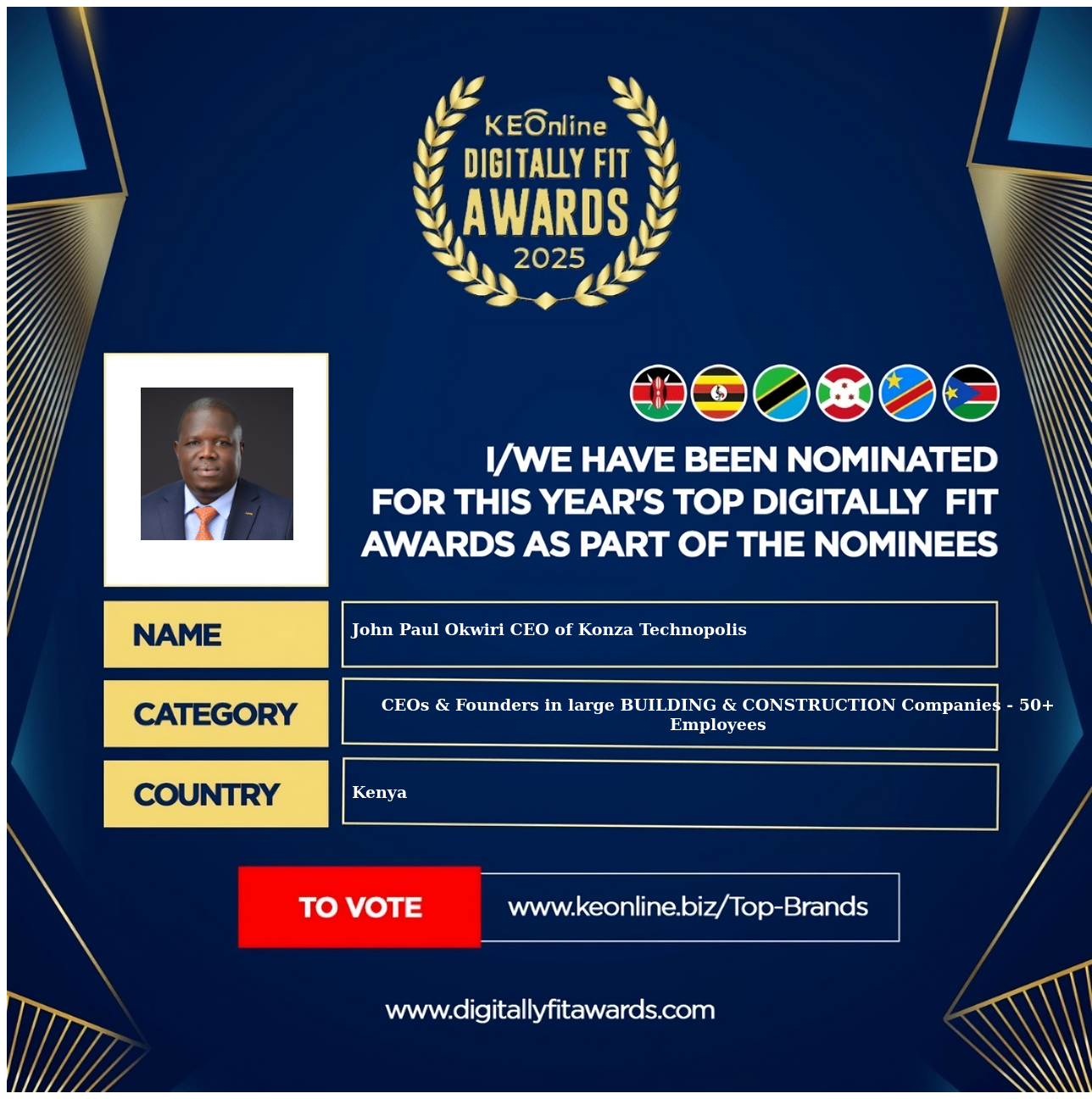 John Paul Okwiri CEO of Konza Technopolis is a company that specializes in CEOs & Founders in large BUILDING & CONSTRUCTION Companies - 50+ Employees, The company has showed exemplary performance in services/products delivery. John Paul Okwiri CEO of Konza Technopolis is located in Kenya, and the address/physical location is at X street address. Are you the owner of this Business? Click here to claim it and update it fully.