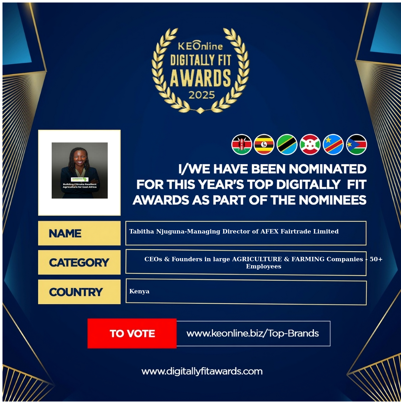 Tabitha Njuguna-Managing Director of AFEX Fairtrade Limited is a company that specializes in CEOs & Founders in large AGRICULTURE & FARMING Companies - 50+ Employees, The company has showed exemplary performance in services/products delivery. Tabitha Njuguna-Managing Director of AFEX Fairtrade Limited is located in Kenya, Nairobi and the address/physical location is at X street address. Are you the owner of this Business? Click here to claim it and update it fully.